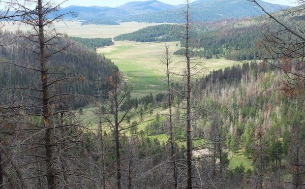 The trail for this hike is called the Abrigo Trail which starts in a meadow, climbs the Southwest side of Cerros Del Abrigo, then traverse the mountain in a counter-clockwise direction (nothing prevents going either direction, but the trail markers are set up to make the route easier to follow by going counter-clockwise). The hike is about a seven miler (11.2 km) with a starting altitude of 8700 feet (2657 m). The route tops out at 9670 feet (2948 m). Cerros Del Abrigo is circled by a bunch of old logging roads (used decades ago) at varying altitudes and the Abrigo Trail makes use of these to climb and then circle the mountain on a high line. (Clicking on the route map above will take you to an interactive map on mapmyhike.com that allows you to locate this hike in NM and the world, provides additional hike data, downloadable .gpx and .kml. and even has a widget that let’s you “fly” the hike route in Google Earth.)