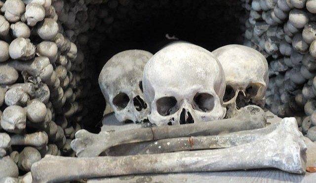 Kutná Hora, founded in the 1100’s, is yet another beautiful, small (population about 20,000) Czech city on the Vrchlice River. It is located in Central Bohemia about 80 kilometers east of Prague. Kutná Hora’s early history was as a silver mining center. The city competed with Prague for Bohemian political and economic importance in the 14th and 15th centuries, and is now a UNESCO World Heritage Site. Beautiful buildings and intrigiung streetscapes seem to be around every corner. The city center is graced with comfortable cafes with nice outdoor spaces. And I can’t help but think about the old song, “Dem Bones”, in conjunction with Kutná Hora, but more about that later …