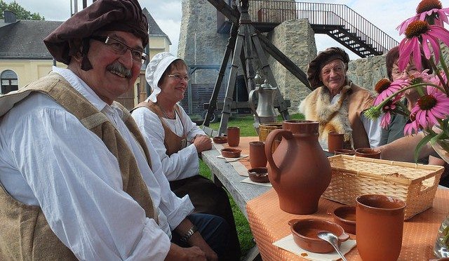 Lichtenberg Castle is a ruin of a hilltop fortress. Some walls and a tower remain adjacent to the picturesque town. The castle here was built in the 1100’s and was destroyed by fire in 1682. The castle walls overlooked East Germany during the Cold War – about a kilometer away. Lichtenberg hosts an annual medieval castle festival and my visit was just the week before the two-day event. This was a memorable visit because we were greeted in style by a friendly contingent of local people in period costume. They treated us to a delicious medieval lunch set up on the castle ruins.